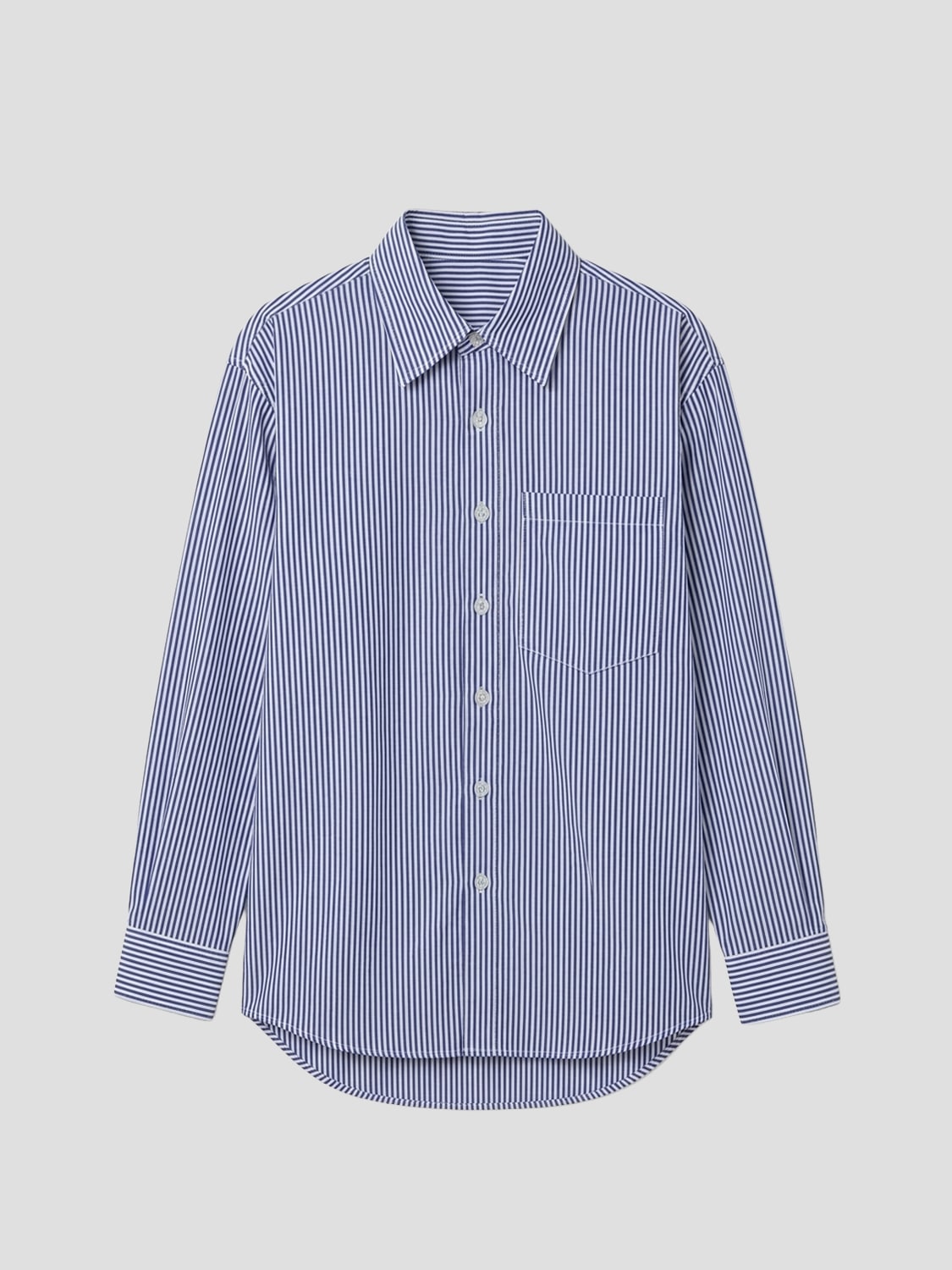 - Spread collar with button closure at front. Single-button barrel cuffs. Shirttail hem.