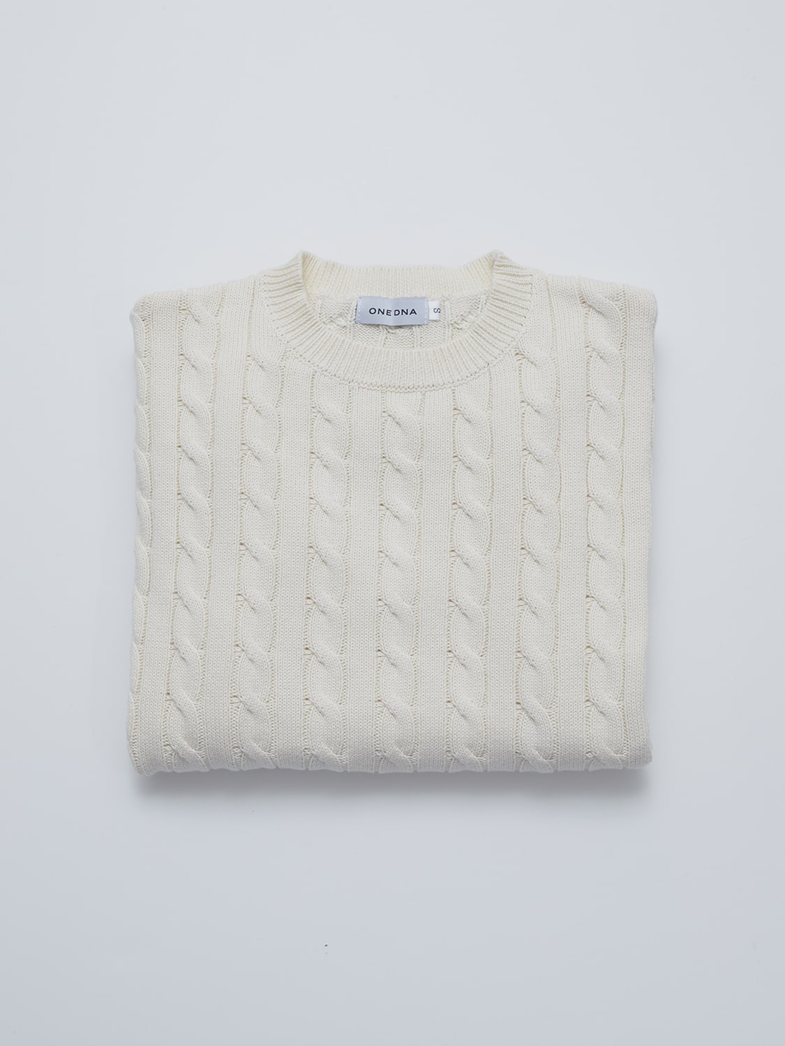 Crewneck cable knit sweater. Medium weight. Breathable. Designed for year-round wear. Ribbed knit neck, cuffs and hem. Classic/timeless. Sophisticated. Relaxed. 100% Cotton.
