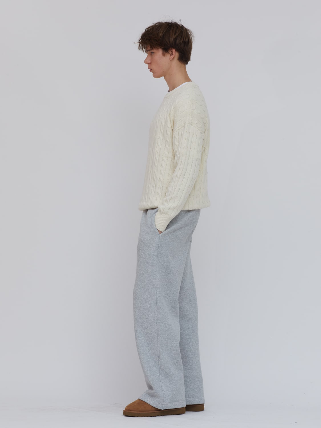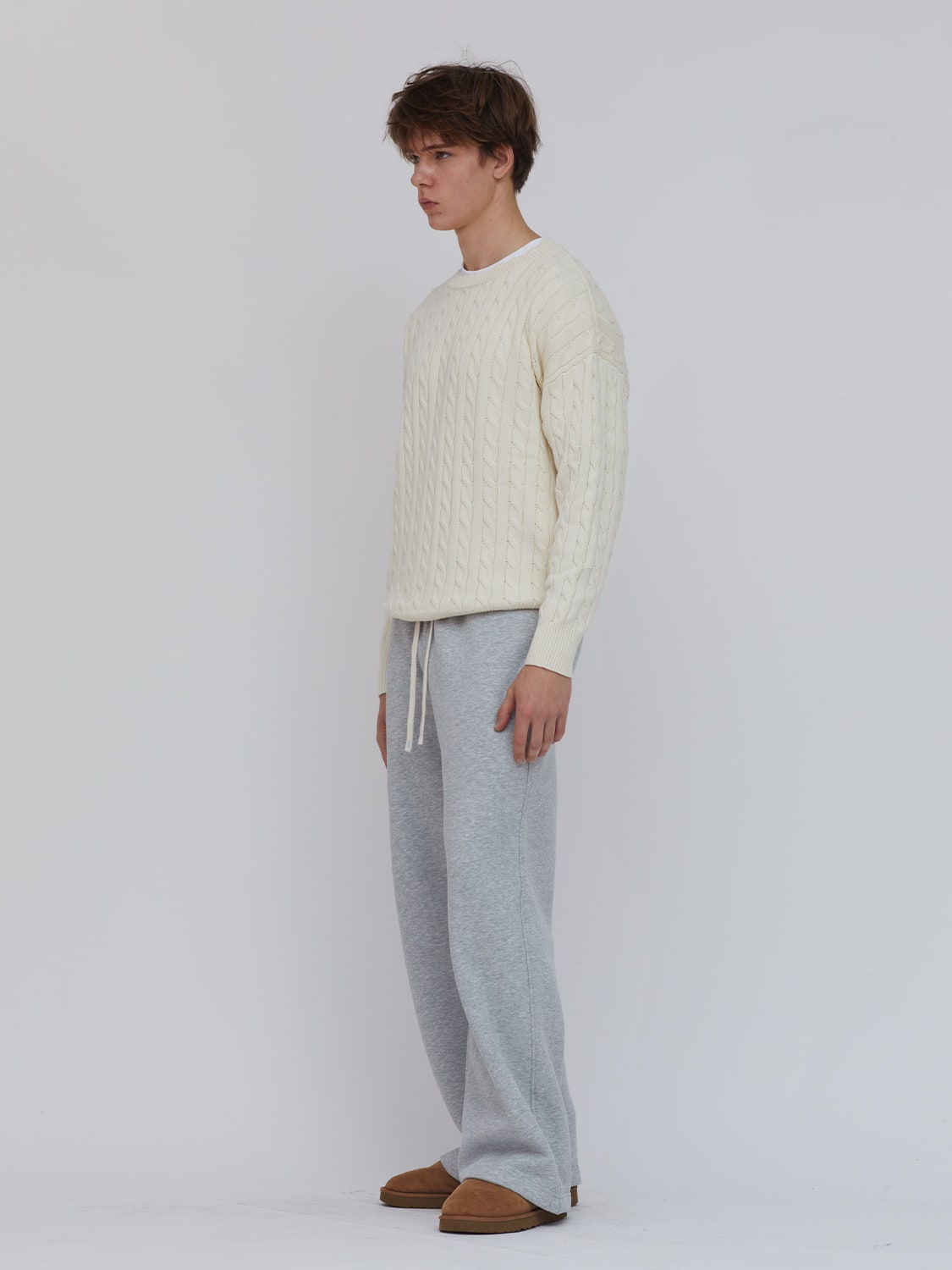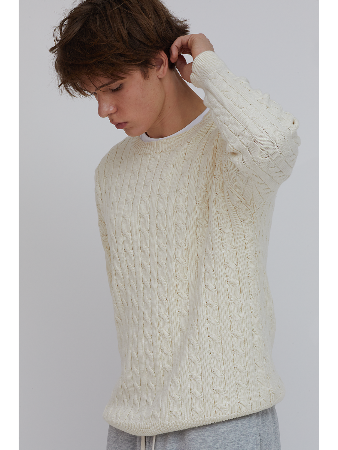 Crewneck cable knit sweater. Medium weight. Breathable. Designed for year-round wear. Ribbed knit neck, cuffs and hem. Classic/timeless. Sophisticated. Relaxed. 100% Cotton.