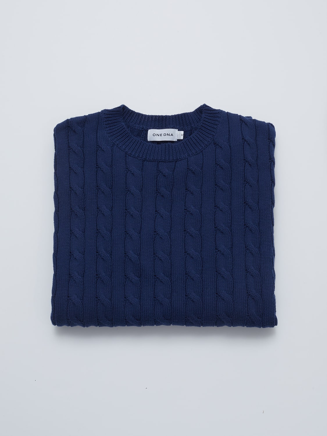 Crewneck cable knit sweater. Medium weight. Breathable. Designed for year-round wear. Ribbed knit neck, cuffs and hem. Classic/timeless. Sophisticated. Relaxed. 100% Cotton.