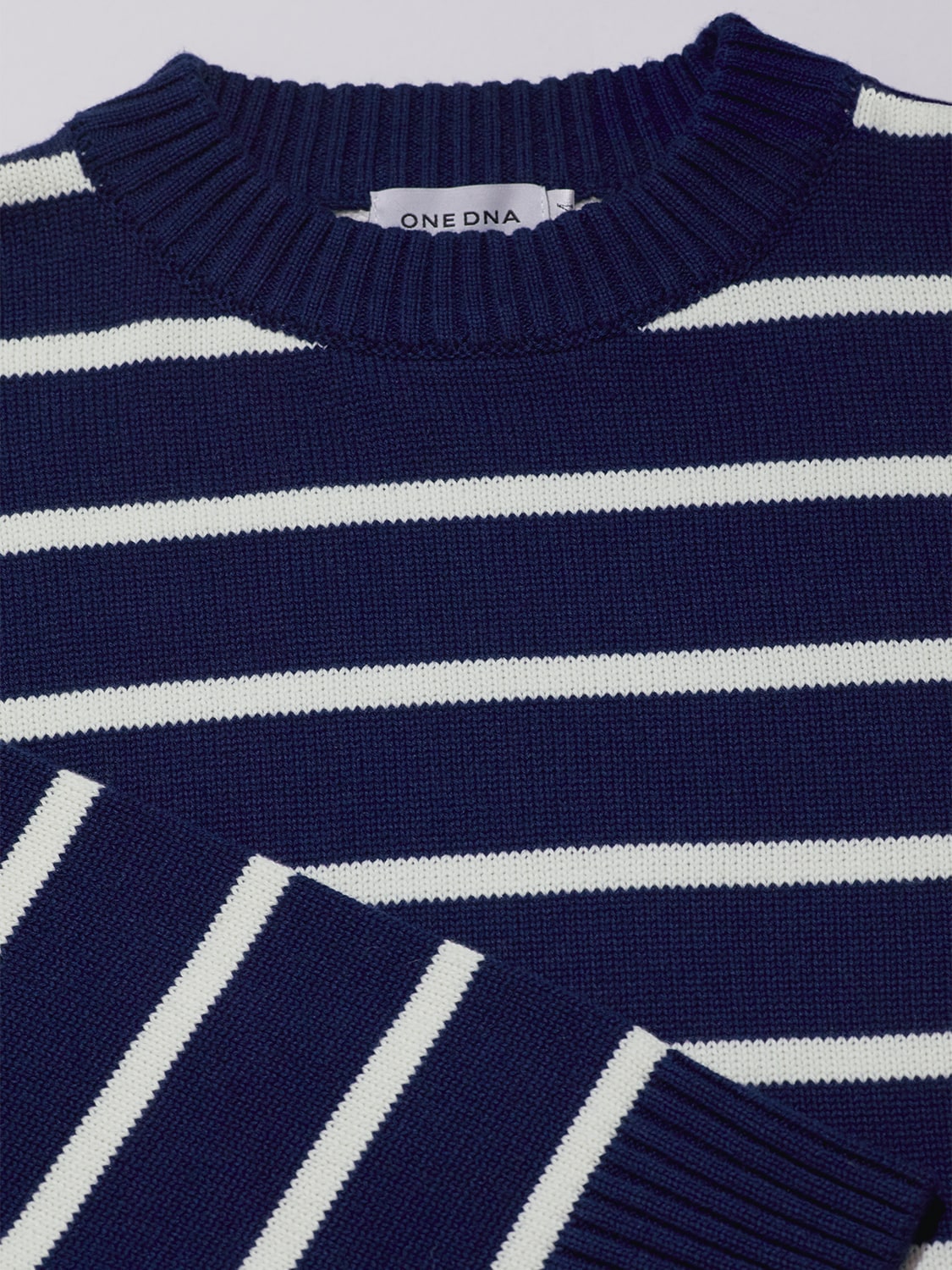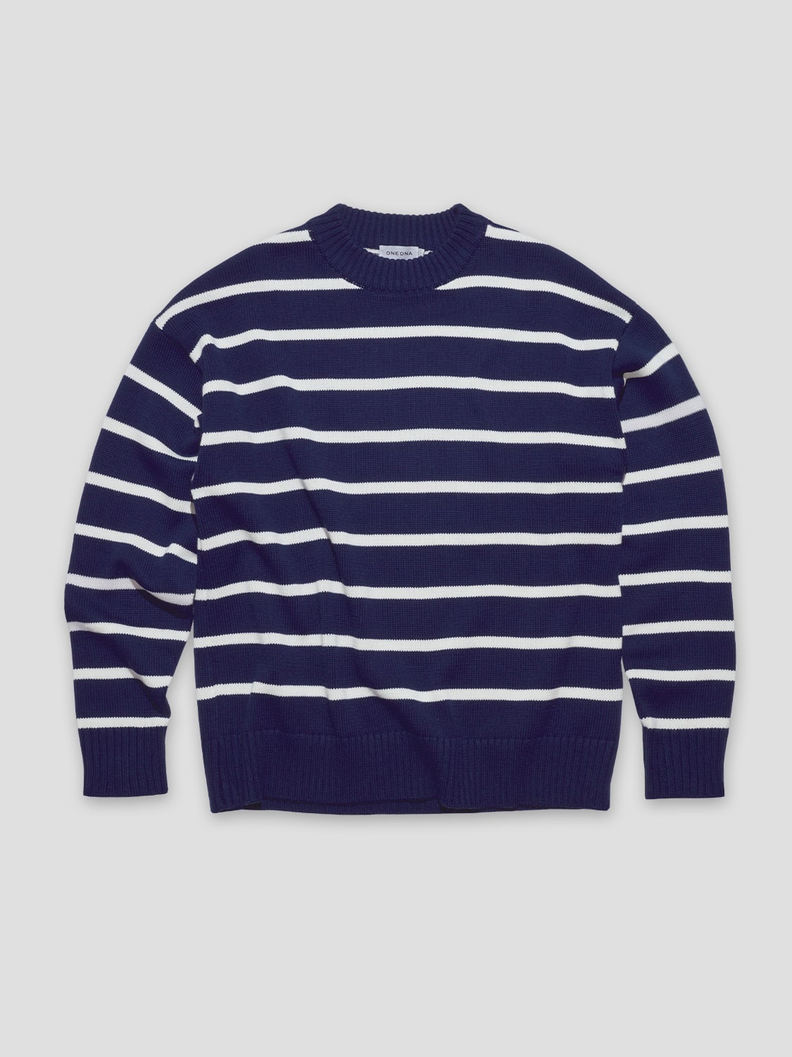 Navy and white striped crewneck sweater. Medium to heavy weight. Drop shoulder. Rib knit neck, hem, and cuffs. Classic/timeless. 60% Cotton, 40% acrylic blend is soft, breathable, and easy to maintain.