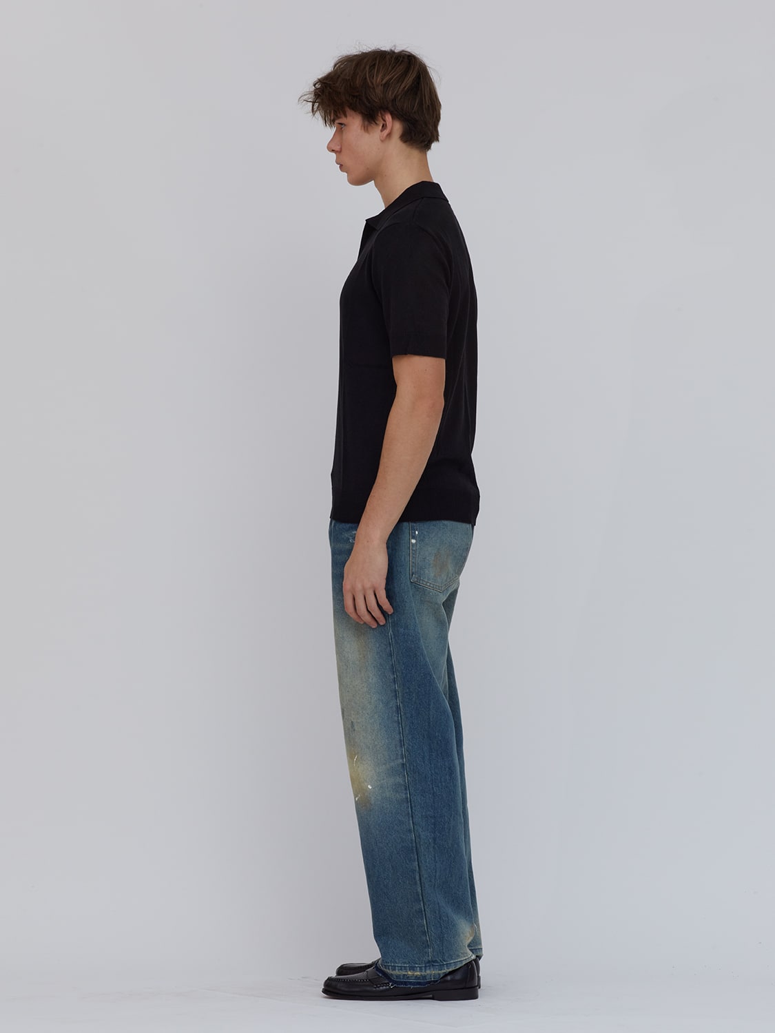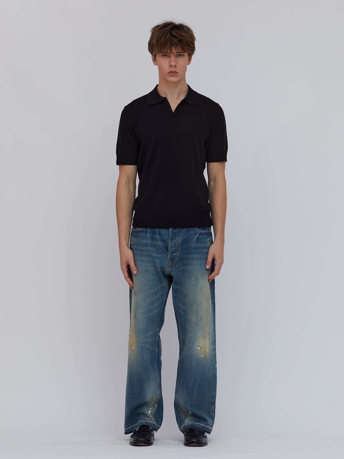 Open-collar knitted polo shirt in black. Rib knit neck, hem, and cuffs. Light to medium weight. Minimal and relaxed. For dressy to casual occasions. 60% Cotton 40% viscose blend is breathable and soft for all-day comfort.