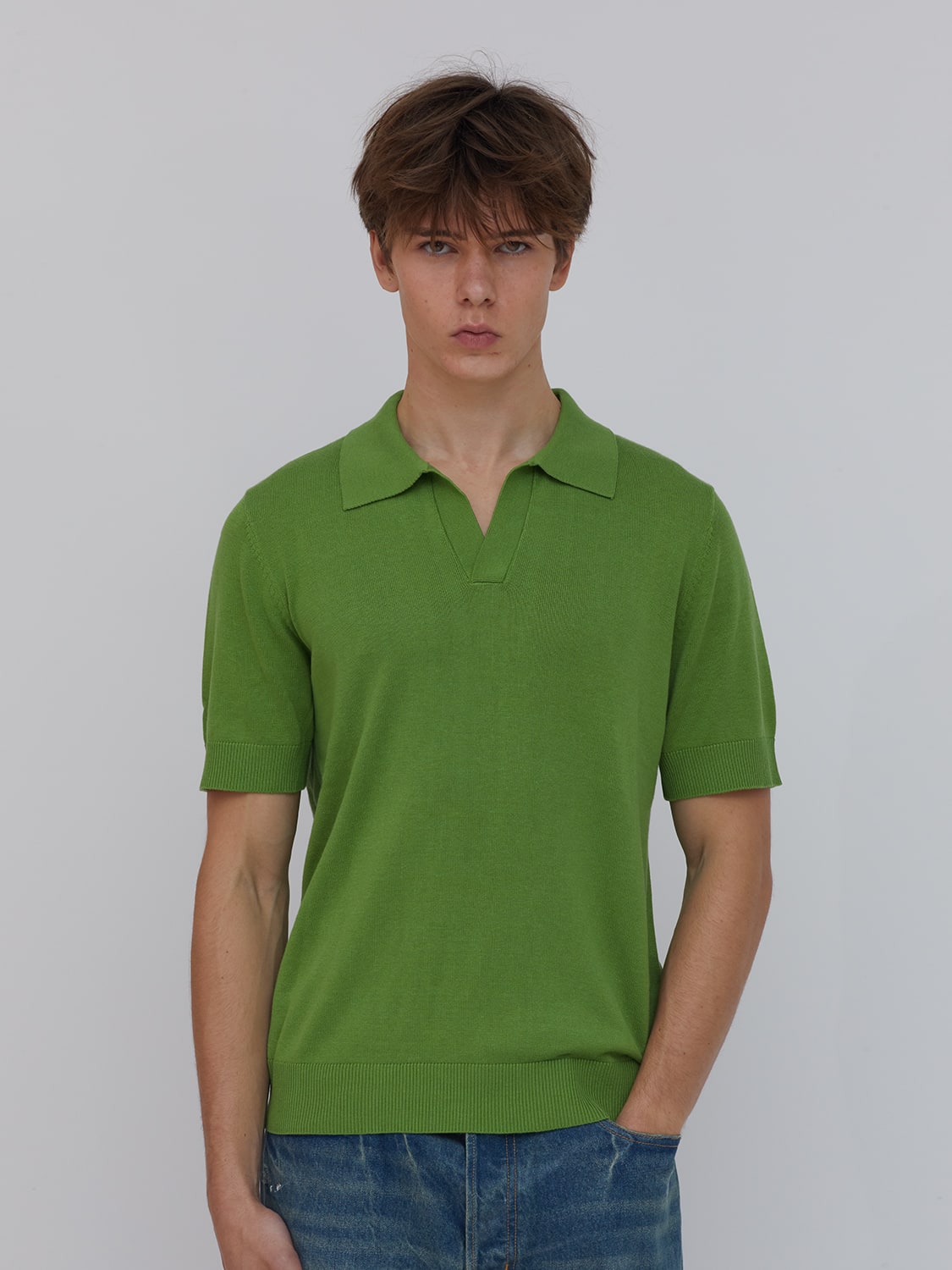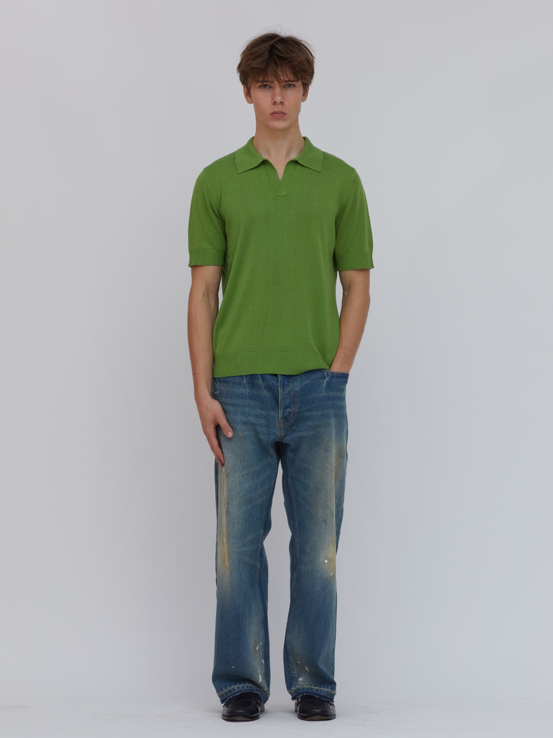 Open-collar knitted polo shirt in matcha green. Rib knit neck, hem, and cuffs. Light to medium weight. Minimal and relaxed. For dressy to casual occasions. 60% Cotton 40% viscose blend is breathable and soft for all-day comfort.