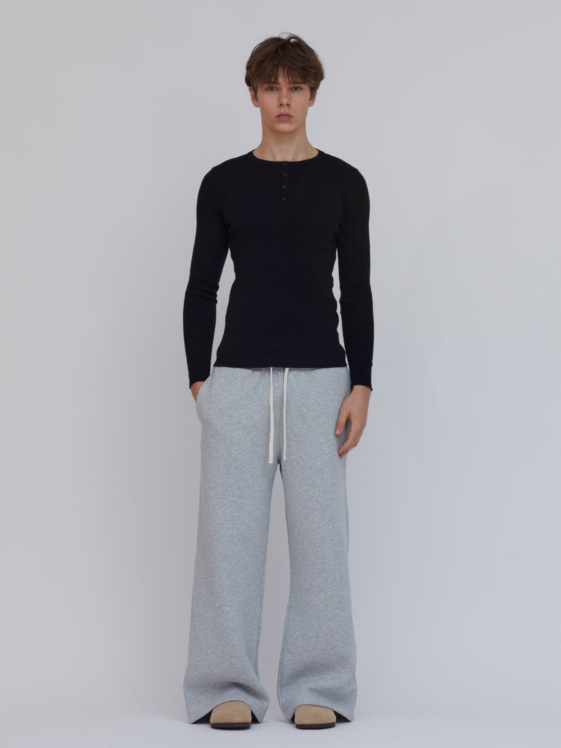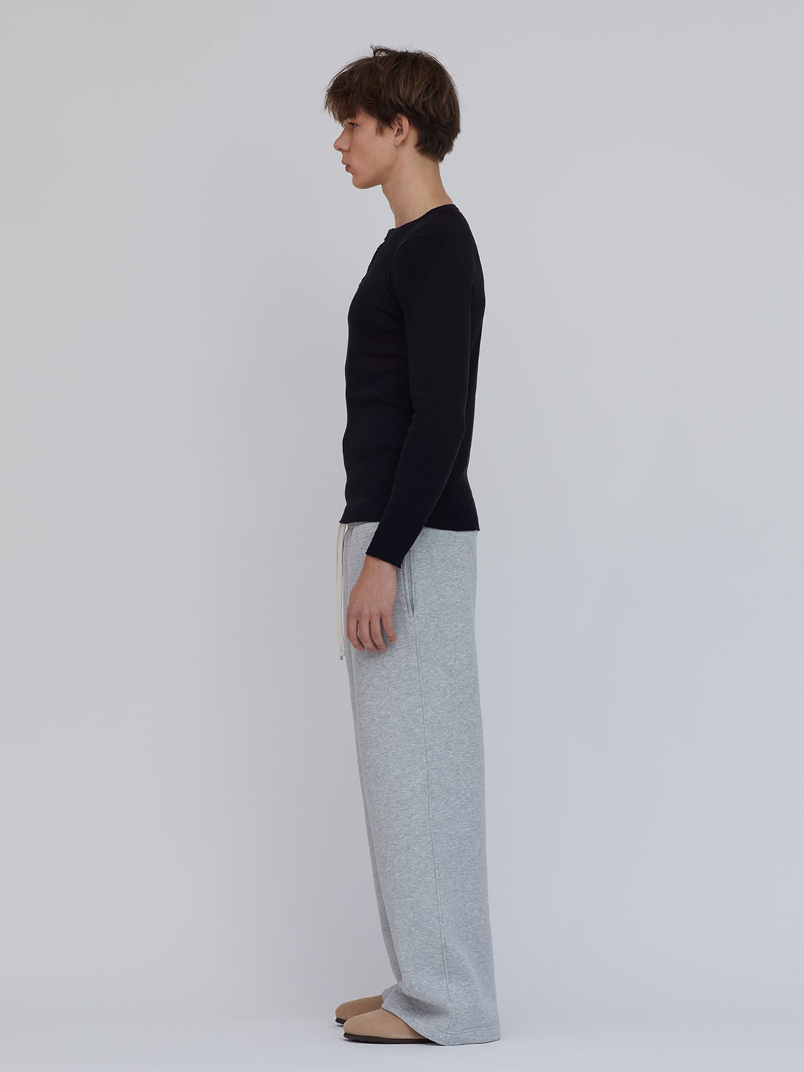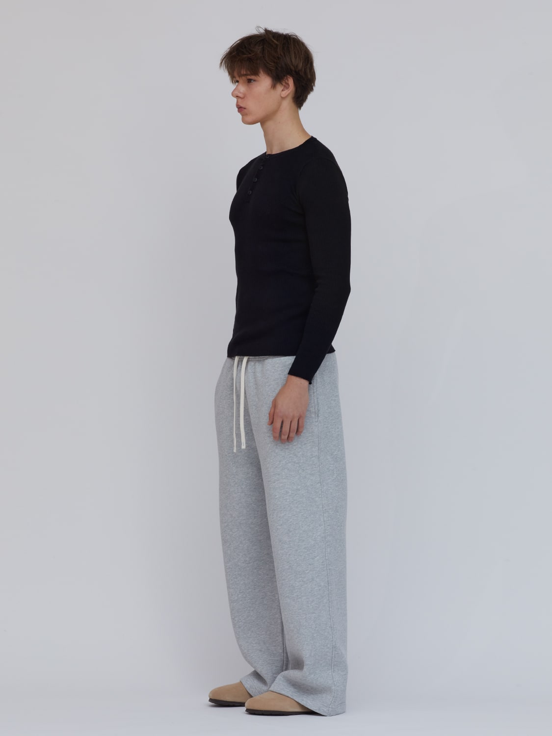 Wide-leg open-bottom sweatpants in sport gray. Medium weight. Ultra cozy. For errands, lounging, gym, sports and recreation, class, travel, everyday wear. Side pockets. Elasticated waistband with drawstring. 52% Cotton 48% polyester. Wrinkle-resistant. Moisture-wicking. Easy to maintain.