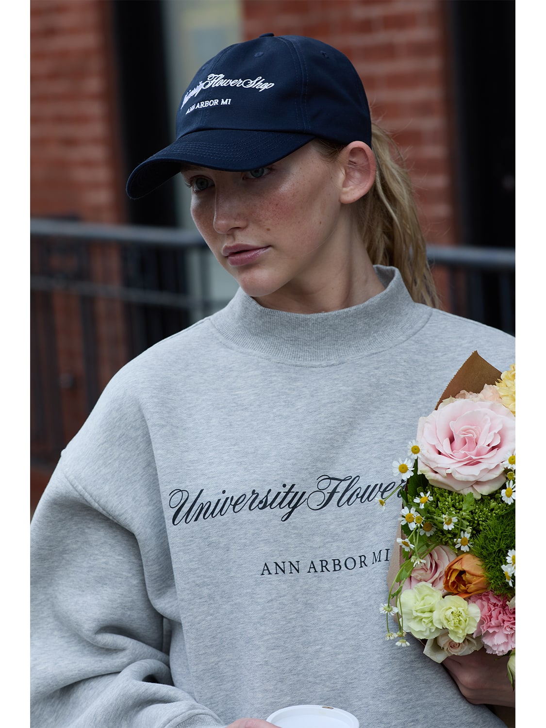 Navy dad hat with University Flower Shop Ann Arbor embroidered at front. Classic unstructured fit featuring low-profile crown and pre-curved brim for a signature dad hat silhouette. Cut from high-density cotton that resists wear and provides a soft, lived-in feel from day one while maintaining the rugged durability required for daily wear. Adjustable self closure in navy with chrome hardware. Tonal embroidered eyelets. One Dna script woven label on inside. PRE-ORDER: Ships early Spring.
