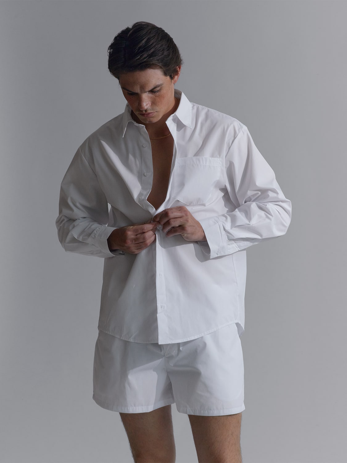 White poplin boxer shorts with two side pockets and one in the back (yes, it fits your phone). Breathable fabric with off-body silhouette provides for all-day comfort. 100% Cotton.