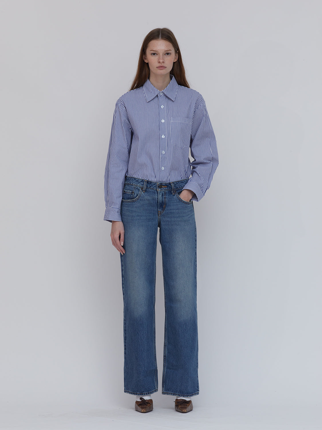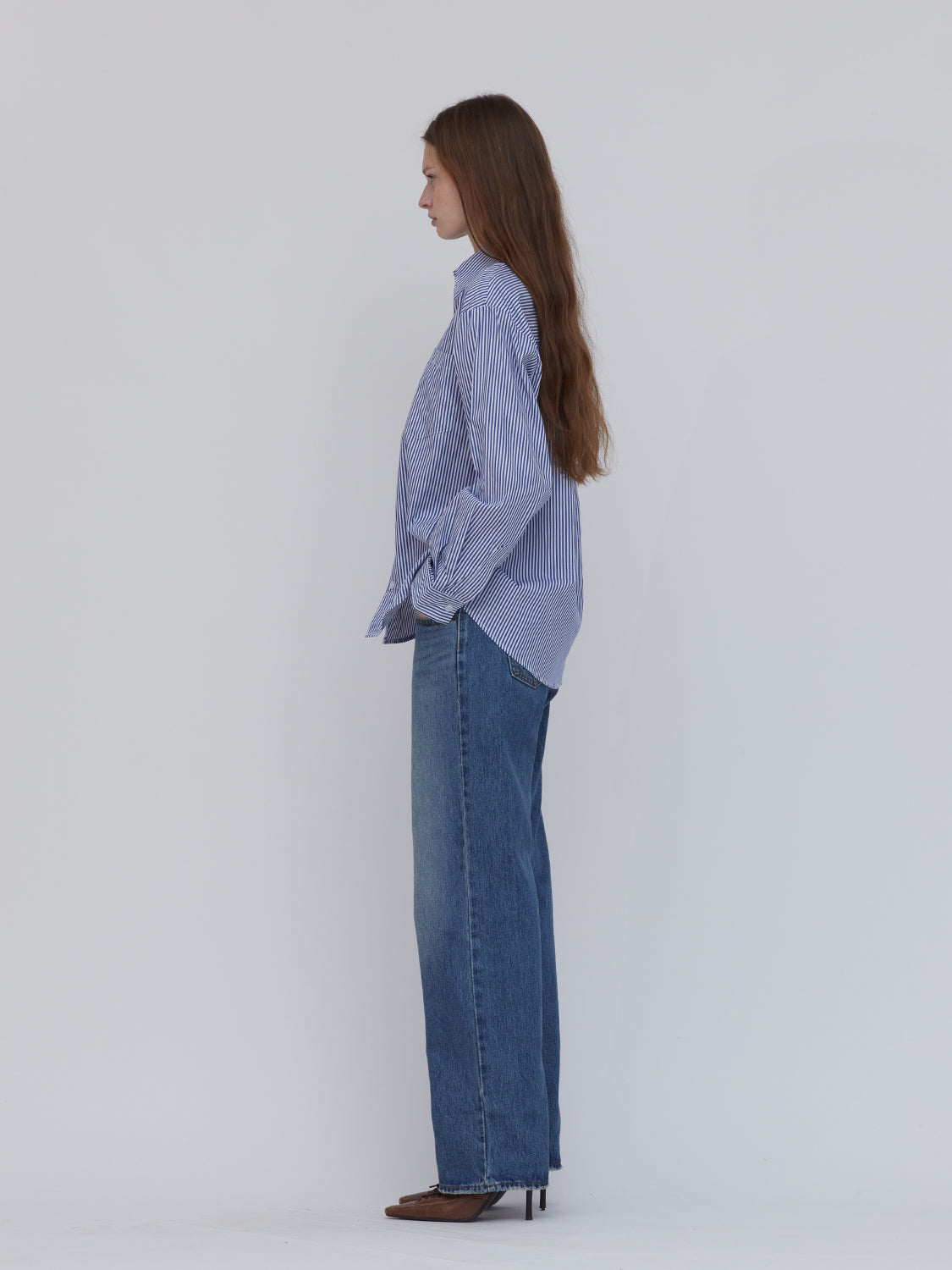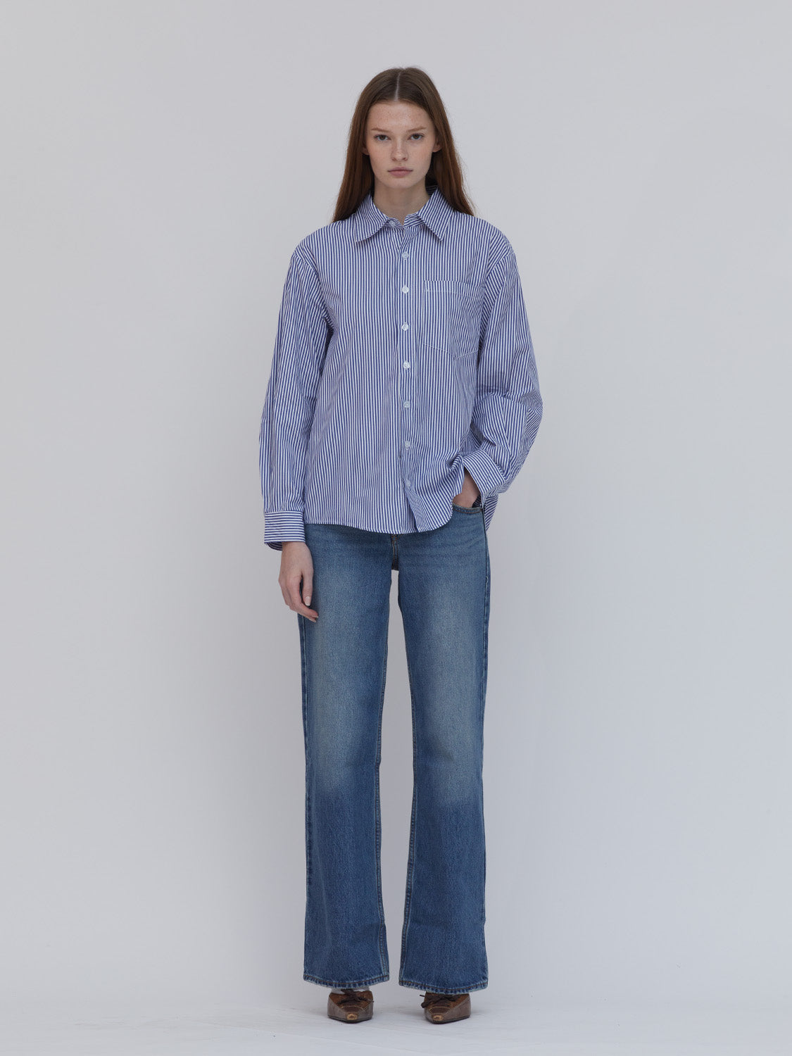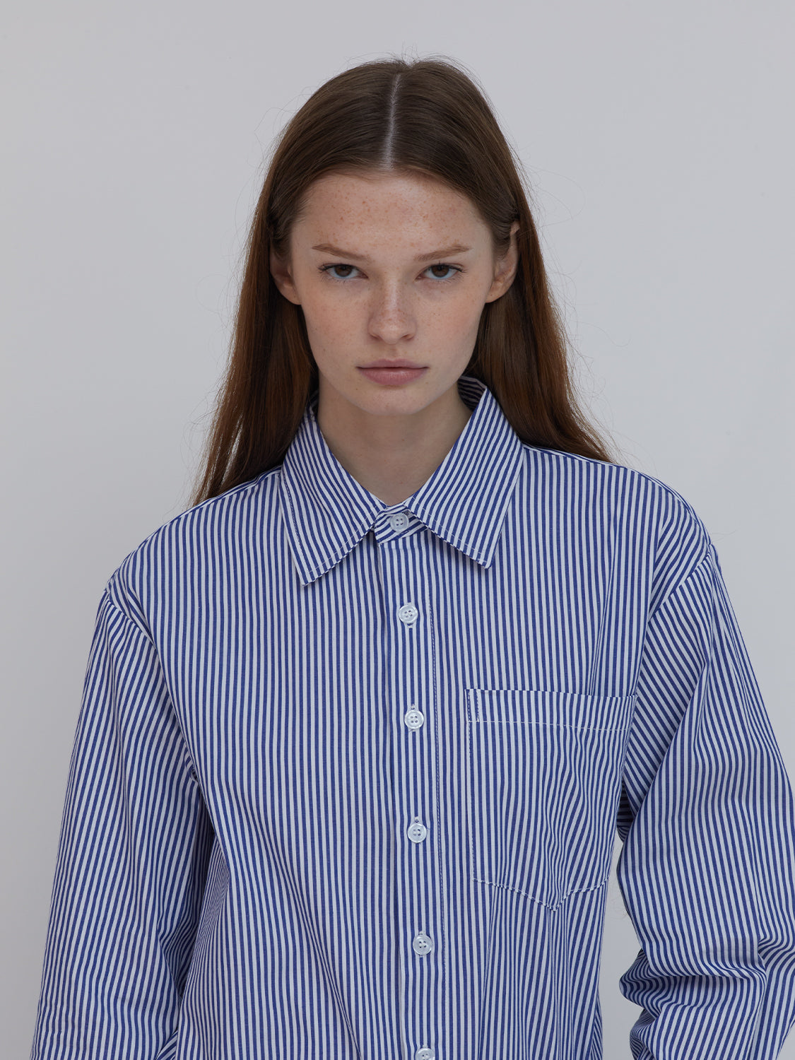 Blue and white stripe poplin long sleeve button up shirt. Spread collar with button closure at front. Single-button barrel cuffs. Shirttail hem. 100% Cotton.