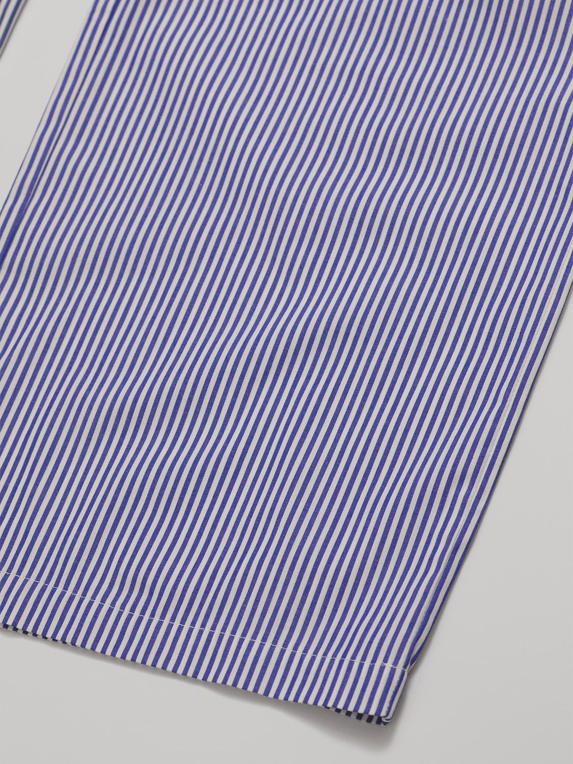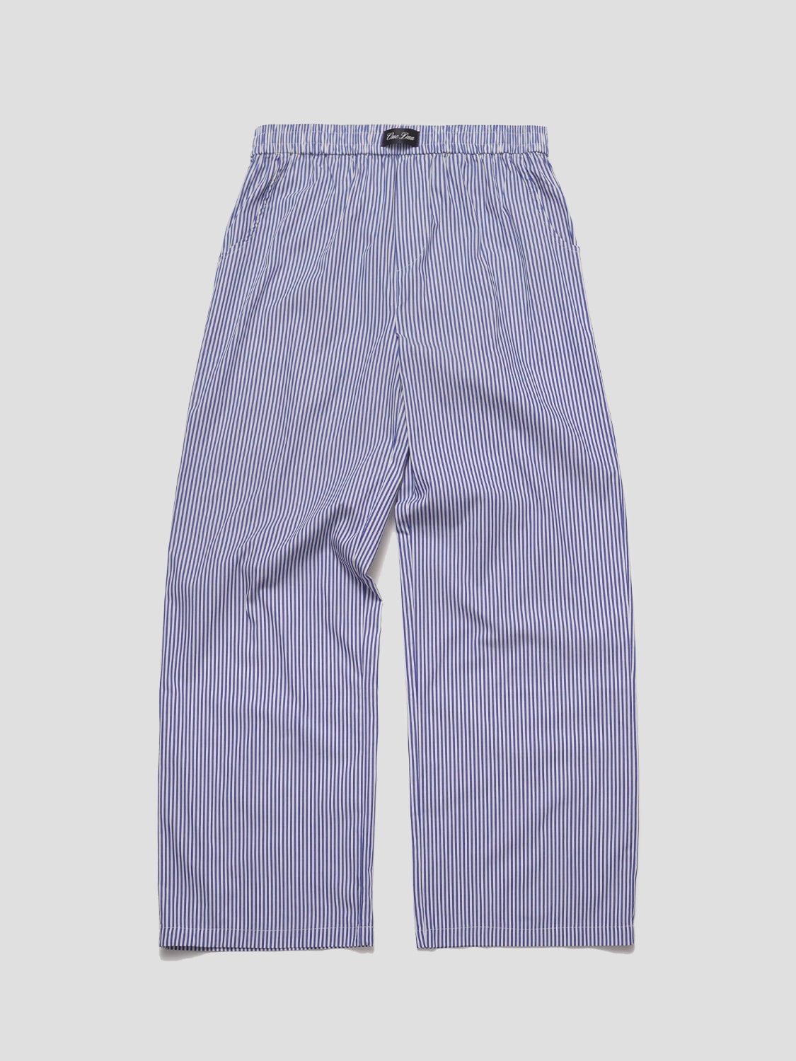 Blue and white striped poplin lounge pants. Two side pockets and one in the back (yes, it fits your phone). Elasticized waistband with inside drawstring. For errands, vacation, around the house, casual events. Minimal. Relaxed. Lightweight. Breathable. 100% Cotton.