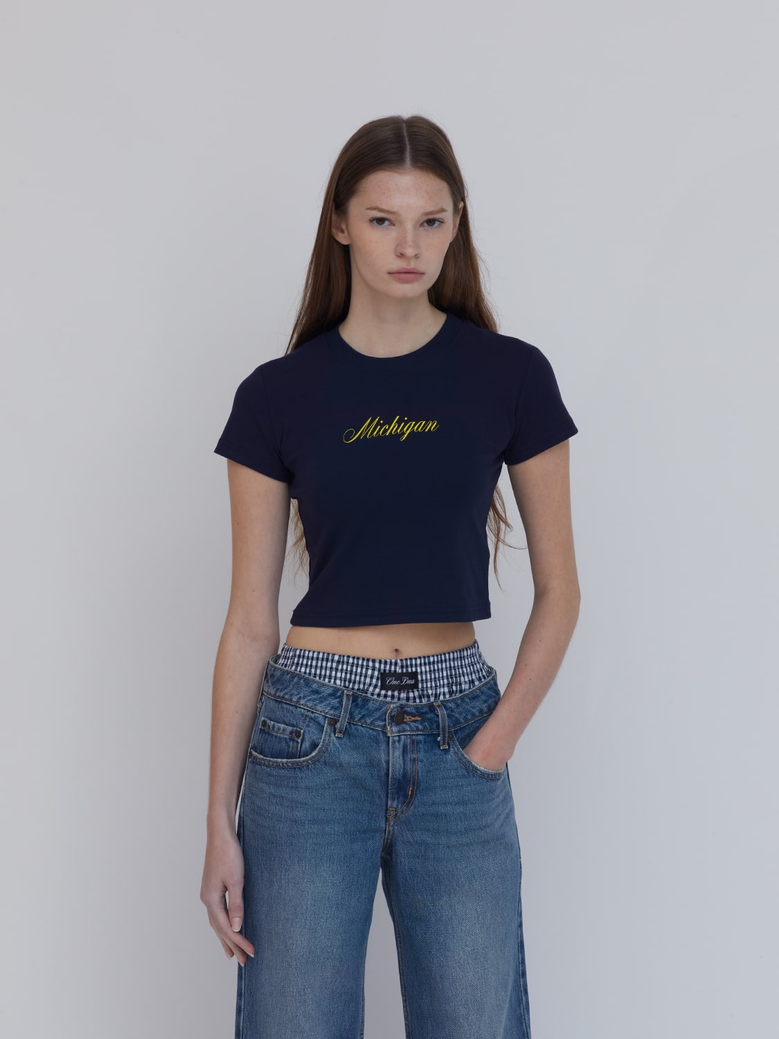 Navy baby tee with Michigan in cursive font screen printed at front. For every day wear, city strolling, gym, sports and recreation, game days, poolside/beach/lake. 92% Cotton 8% spandex.