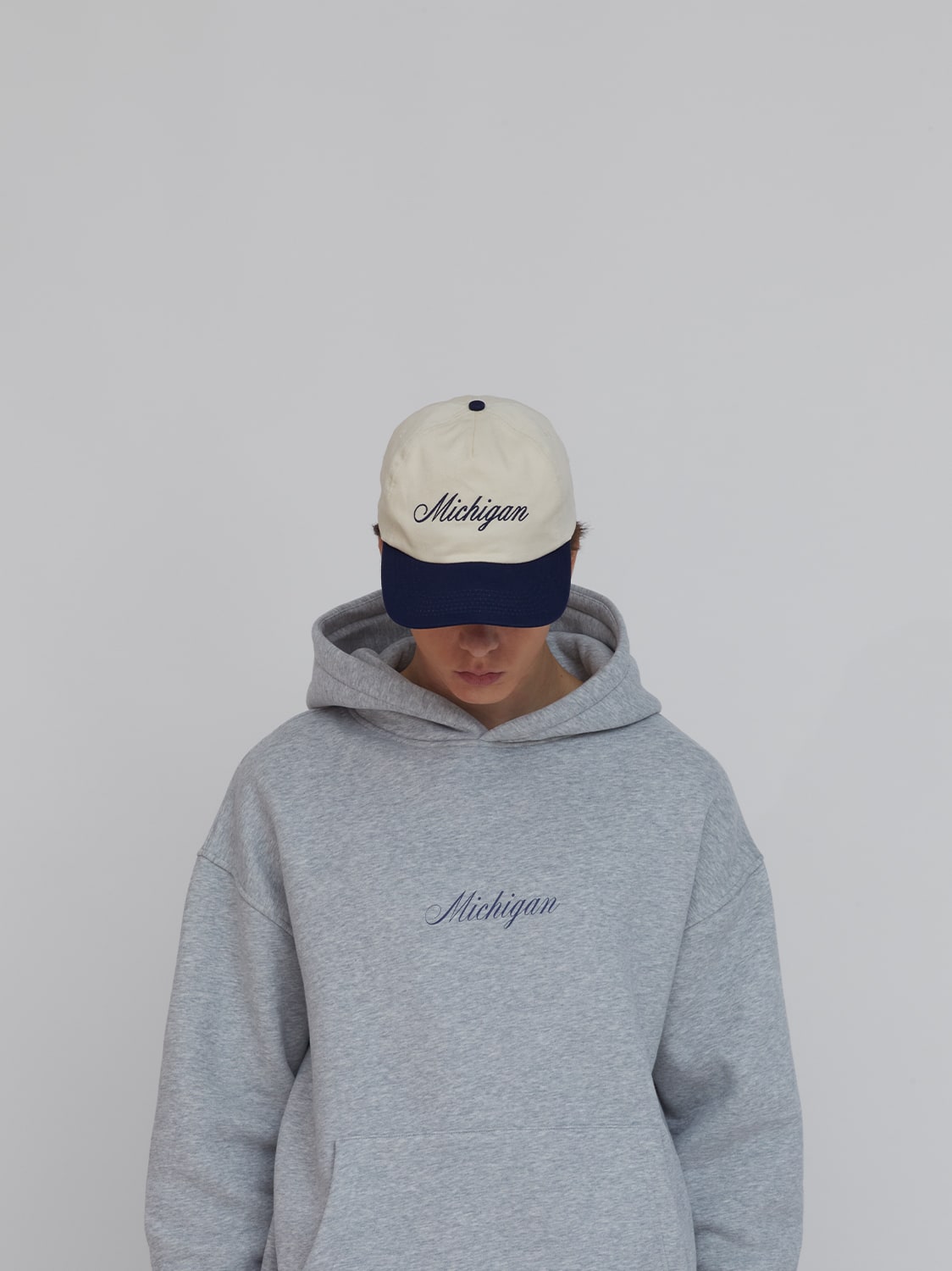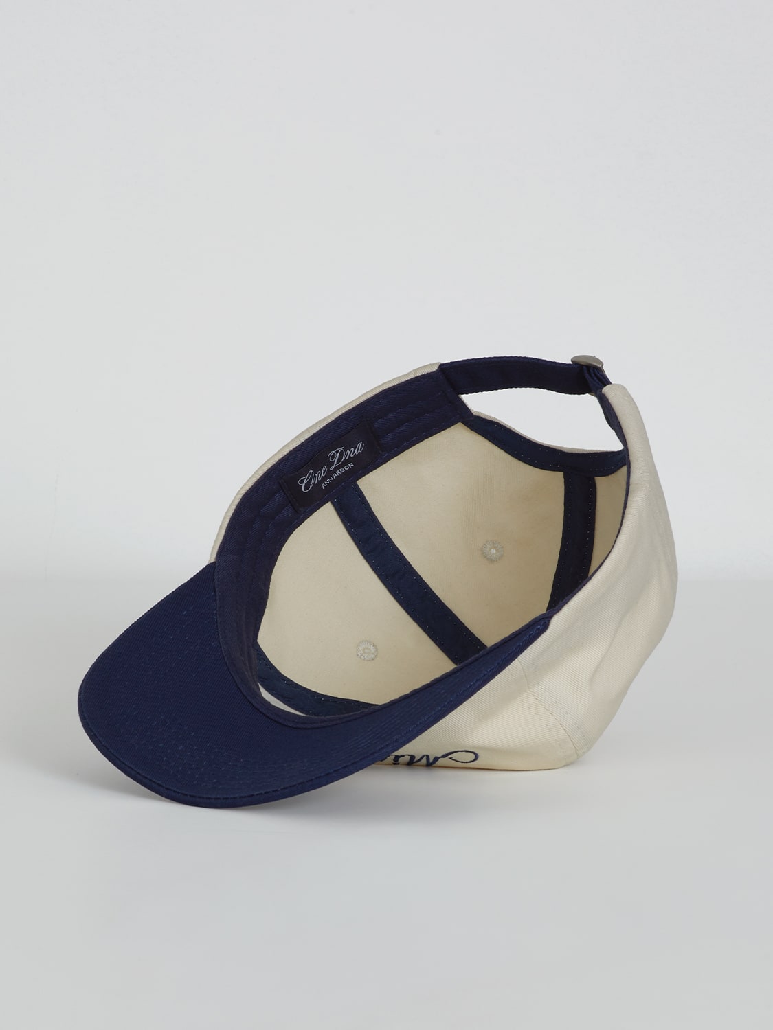 Off white hat with Michigan in cursive font embroidered at front in navy and navy brim. Custom five panel design. Flat brim can be curved to shape. Adjustable self closure in navy with chrome hardware. Tonal embroidered eyelets. ONE DNA Ann Arbor woven label on inside.100% Cotton.