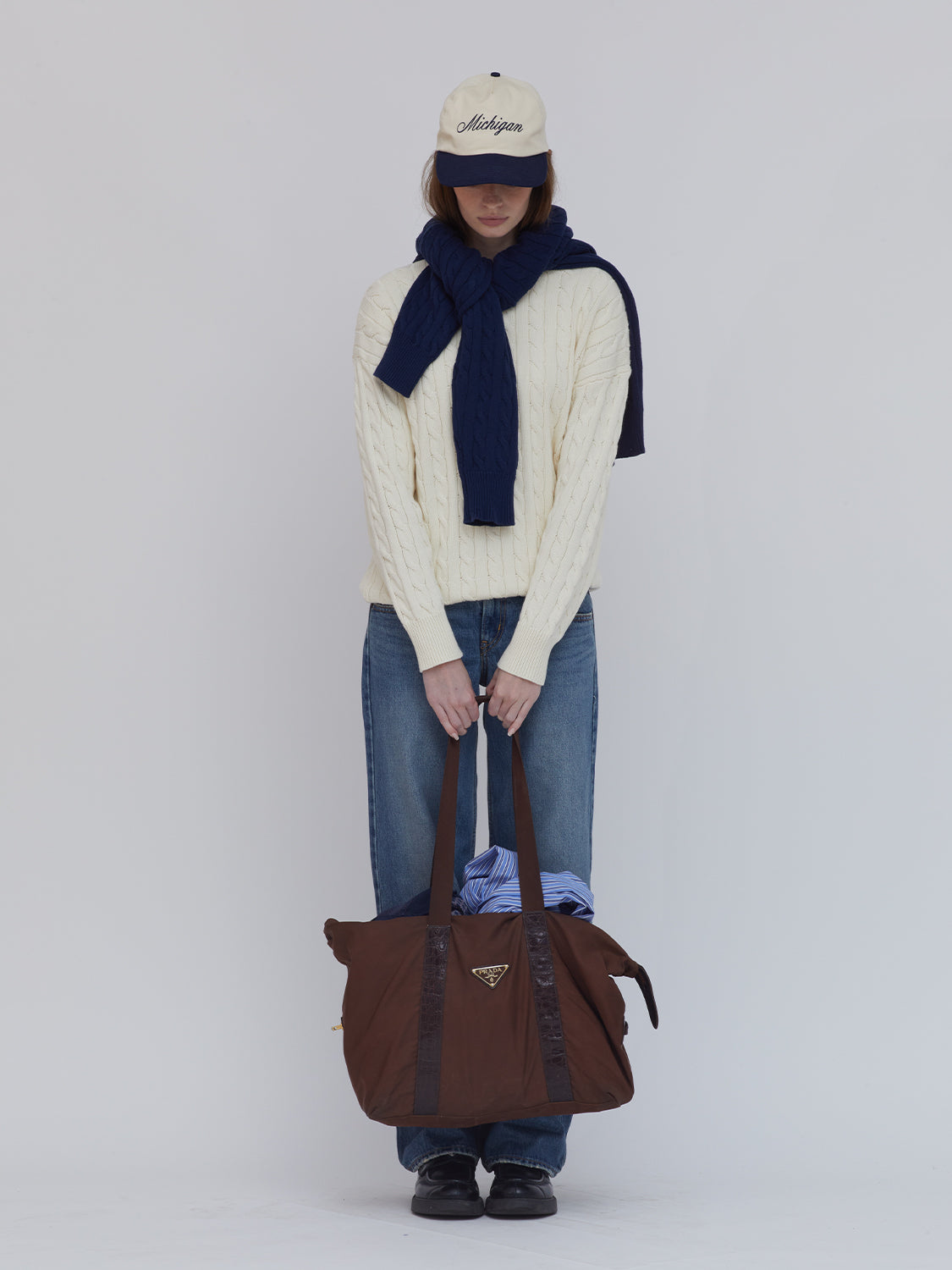 Off white hat with Michigan in cursive font embroidered at front in navy and navy brim. Custom five panel design. Flat brim can be curved to shape. Adjustable self closure in navy with chrome hardware. Tonal embroidered eyelets. ONE DNA Ann Arbor woven label on inside.100% Cotton.