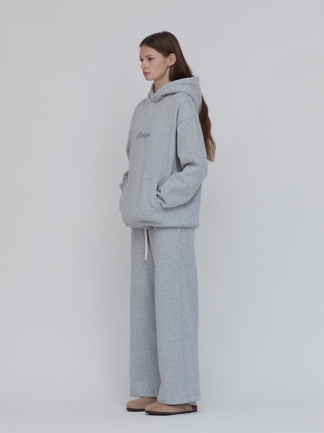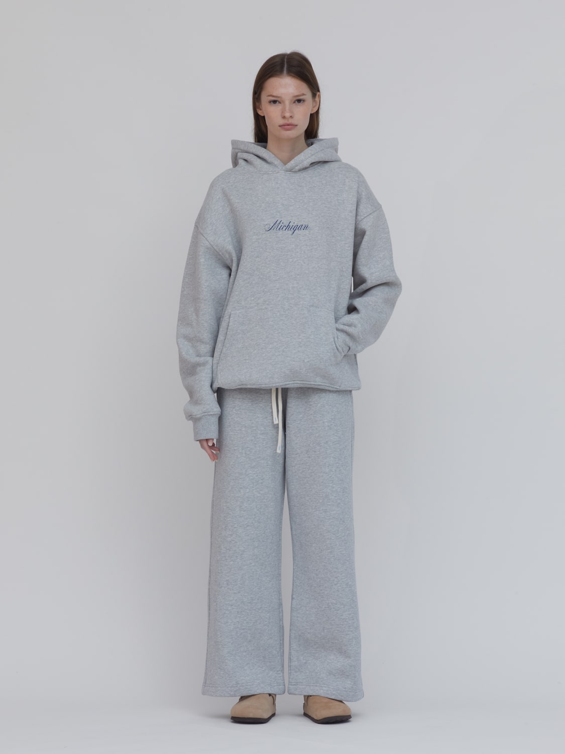Gray hoodie with Michigan in cursive font screen printed at front. Vintage sportswear mood. Ultra cozy. For gym, sports and recreation, game days, travel, lounging, class, everyday wear. Kangaroo pocket. Ribbed cuffs and hem. 52% Cotton 48% polyester. Wrinkle-resistant. Moisture-wicking. Easy to maintain.