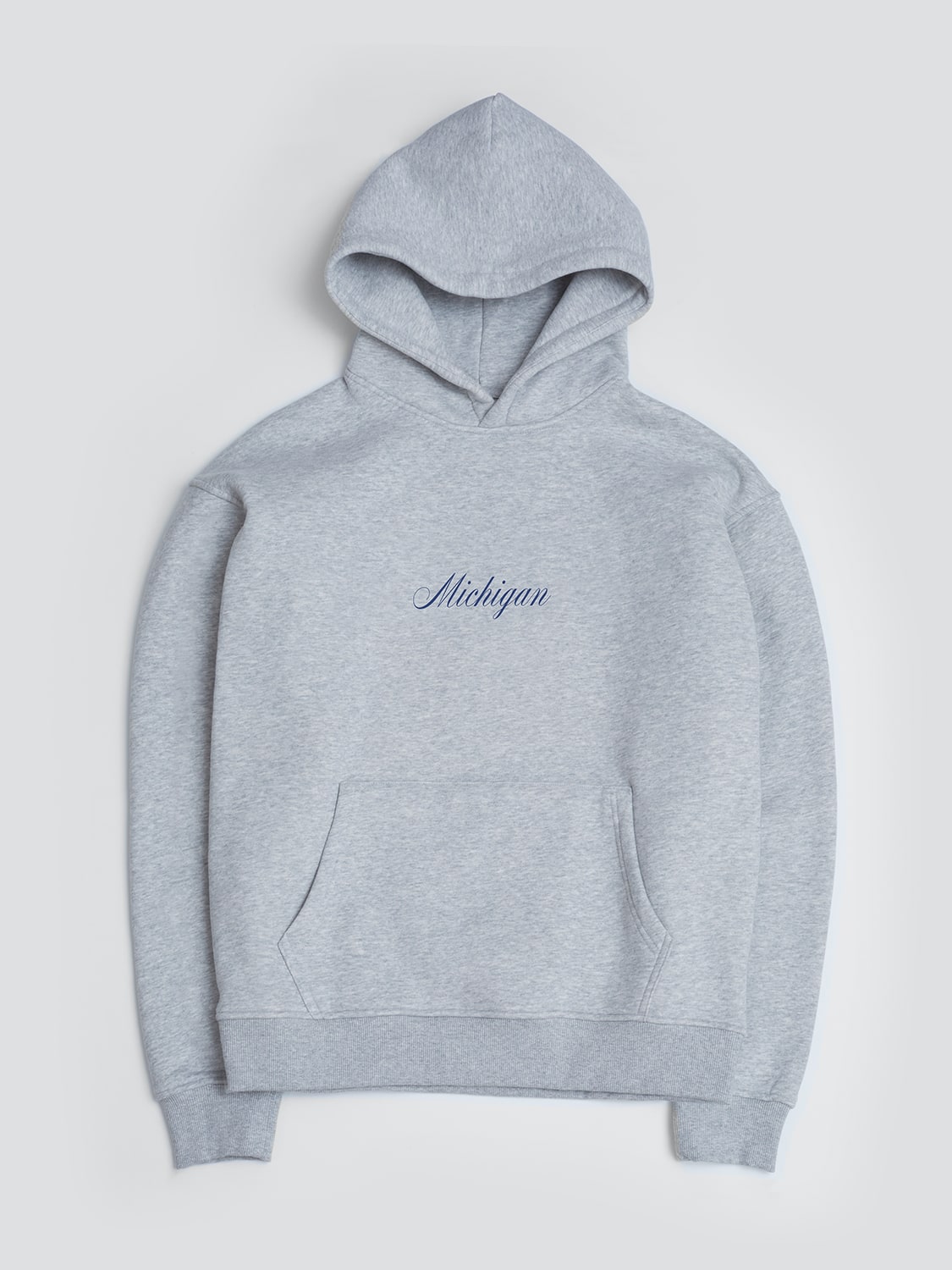 Gray hoodie with Michigan in cursive font screen printed at front. Vintage sportswear mood. Ultra cozy. For gym, sports and recreation, game days, travel, lounging, class, everyday wear. Kangaroo pocket. Ribbed cuffs and hem. 52% Cotton 48% polyester. Wrinkle-resistant. Moisture-wicking. Easy to maintain. Wash-tested.