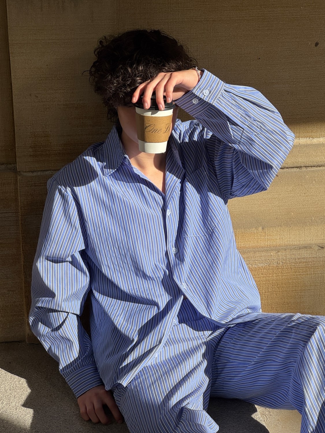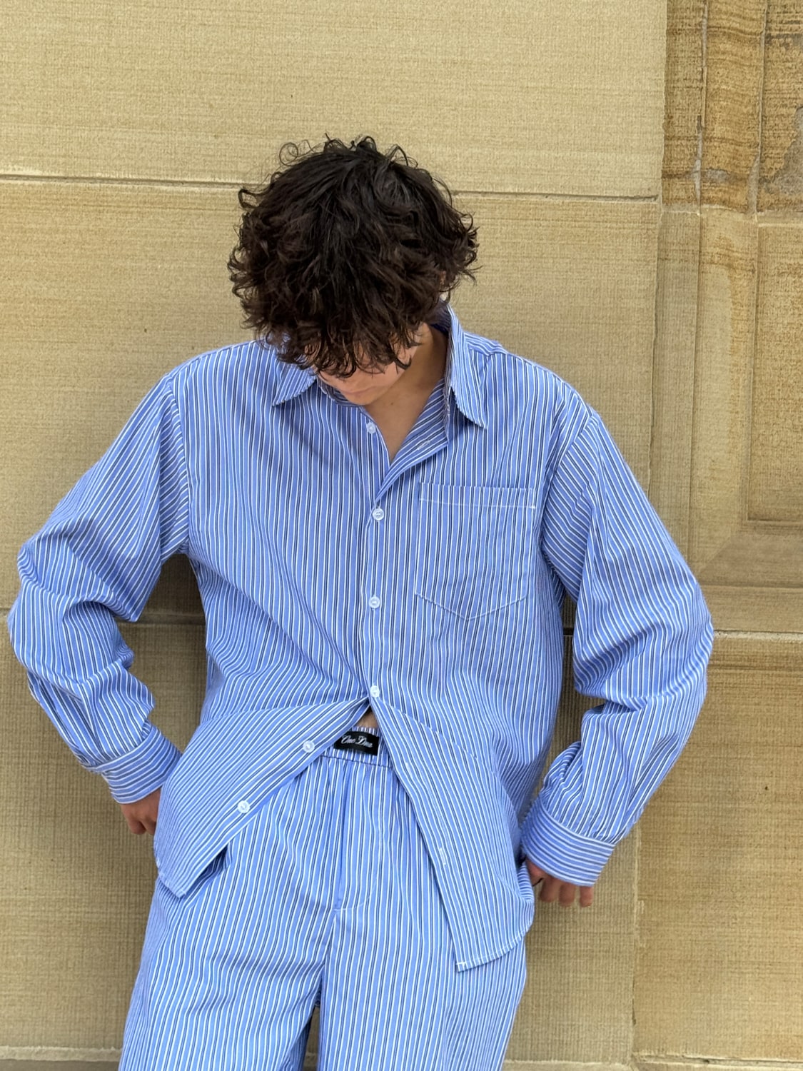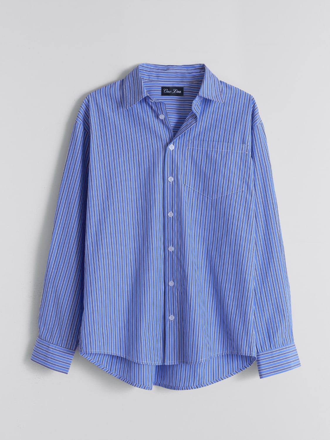 Long sleeve button up pinstripe shirt. FW25 Release. Spread collar with button closure at front and single-button barrel cuffs. Shirttail hem. For errands, dressy occasions, work, city strolling, date nights, travel, lounging, casual events, layering. 100% Polyester fabric is wrinkle and stain resistant. Wash-tested.