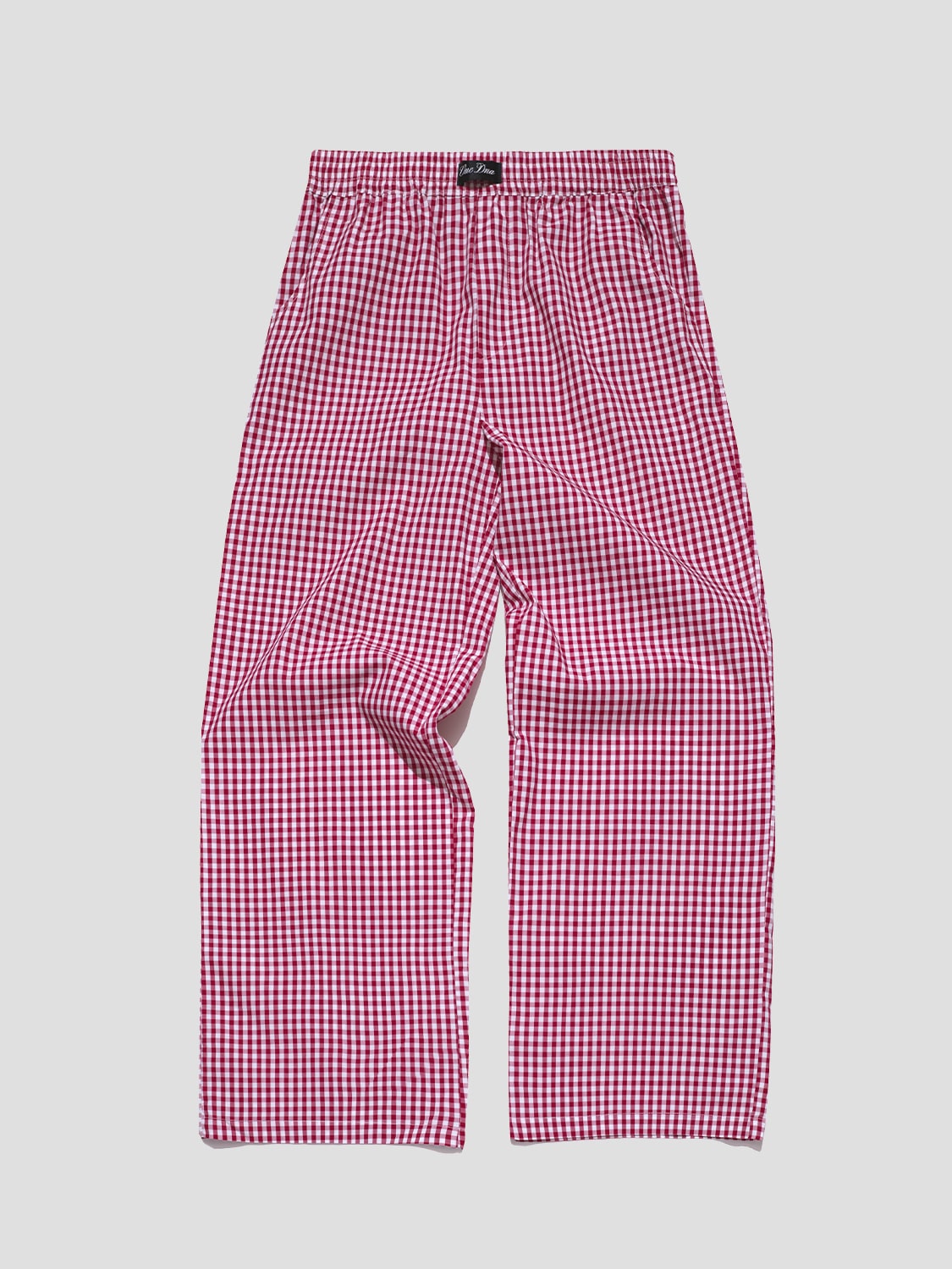 Red and white gingham lounge pants. Two side pockets and one in the back (yes, it fits your phone). Elasticized waistband with inside drawstring. For errands, vacation, around the house, casual events. Minimal. Relaxed. Lightweight. Breathable. 100% Cotton.