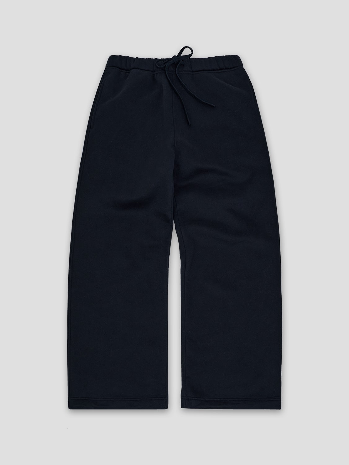 Black wide-leg open-bottom sweatpants. Medium to heavy weight. Ultra cozy. For errands, lounging, gym, sports and recreation, class, travel, everyday wear. Side pockets. Elasticated waistband with drawstring. 52% Cotton 48% polyester. Wrinkle-resistant. Moisture-wicking. Easy to maintain.