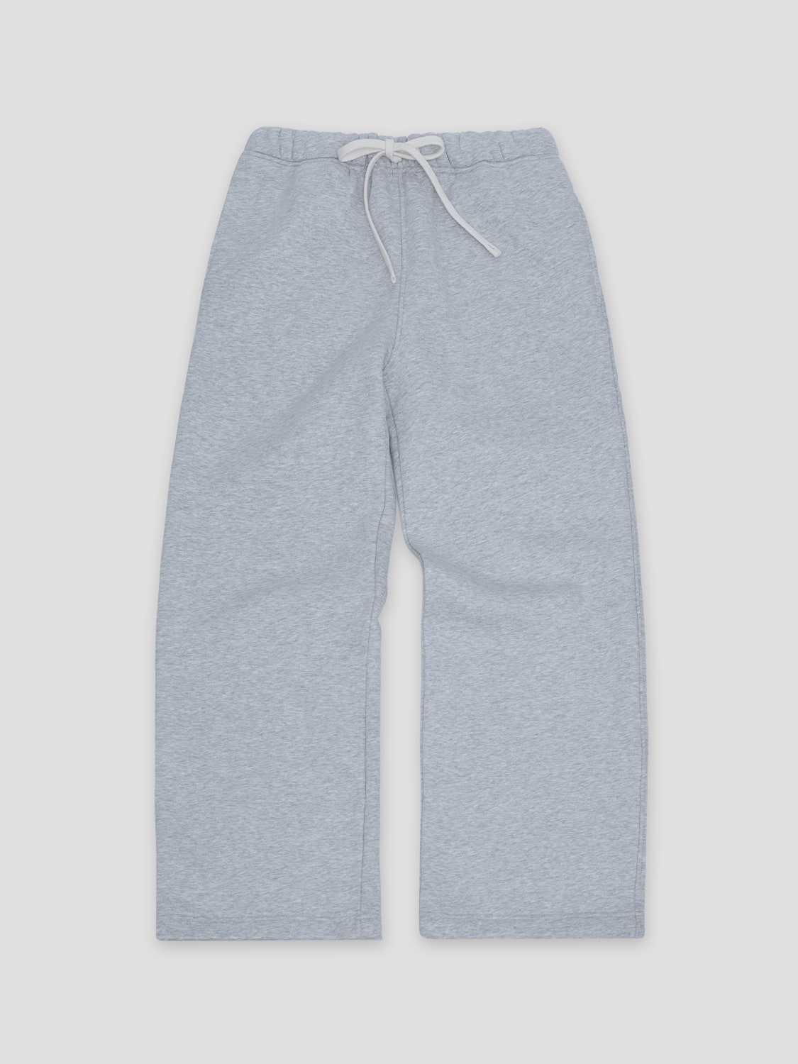 Heather gray wide-leg open-bottom sweatpants. Medium to heavy weight. Ultra cozy. For errands, lounging, gym, sports and recreation, class, travel, everyday wear. Side pockets. Elasticated waistband with drawstring. 52% Cotton 48% polyester. Wrinkle-resistant. Moisture-wicking. Easy to maintain.