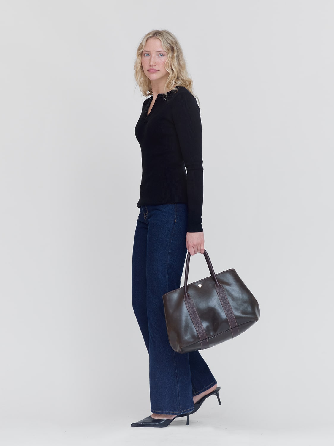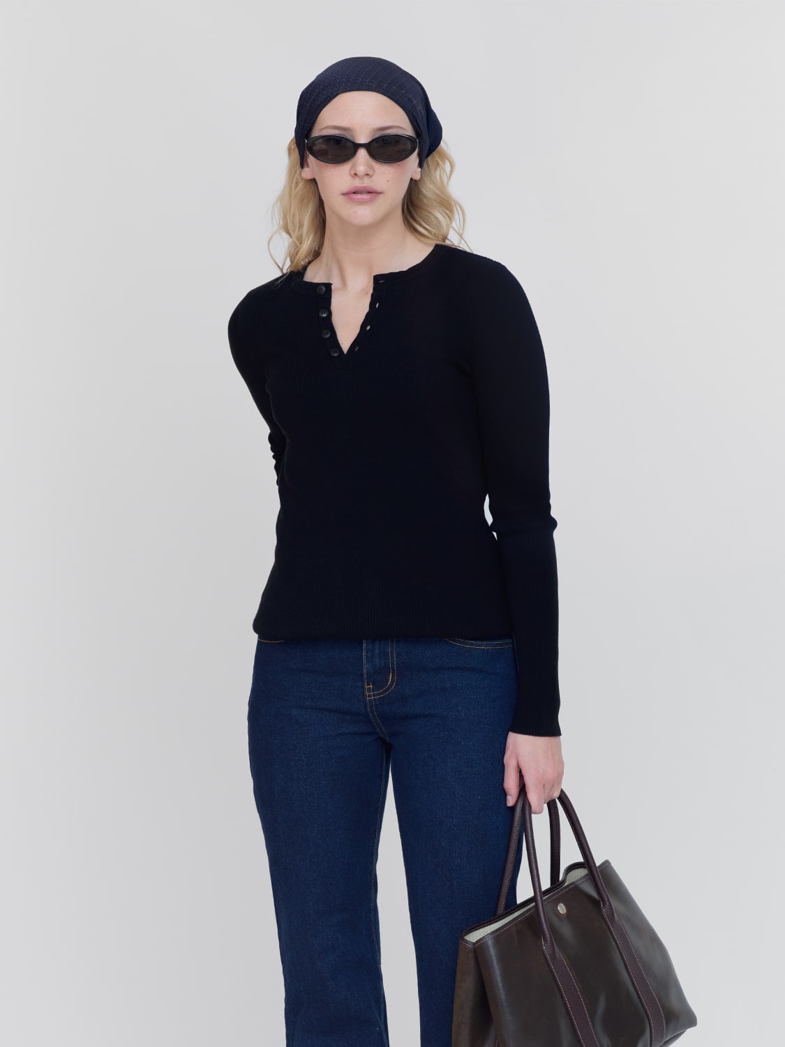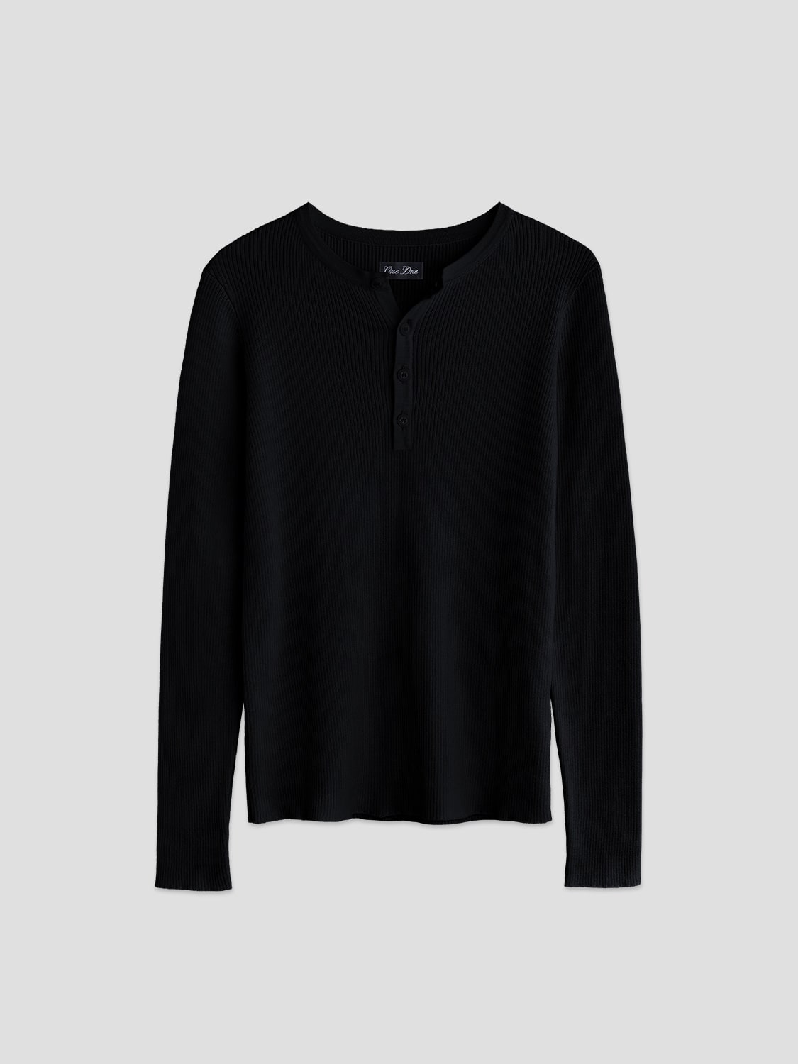 Black ribbed henley with four-button closure. Medium weight. Minimal. For dressy to casual occasions, city strolling, date nights, travel, lounging, layering. 60% Cotton 40% viscose blend is breathable and soft for all-day comfort.